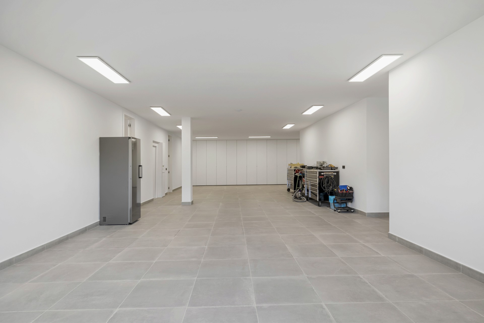 The lower floor offers a large multipurpose room, an additional guest toilet, storage space, and a garage for two cars. Next to the garage is a covered carport accommodating two more vehicles.