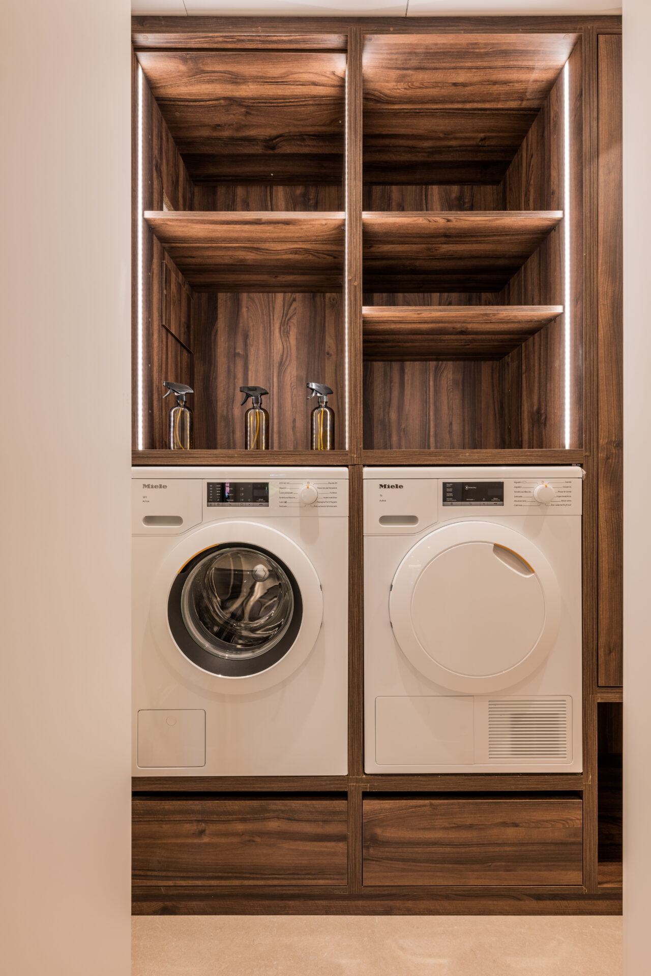 The interior features elegant flooring, a brand-new designer kitchen fitted with premium Miele appliances, tailor-made wardrobes, a Bang & Olufsen sound system, and an electric fireplace. The open-plan layout creates a seamless flow between living spaces, while large sliding doors connect the interior to an expansive private terrace, ideal for outdoor dining and relaxation.