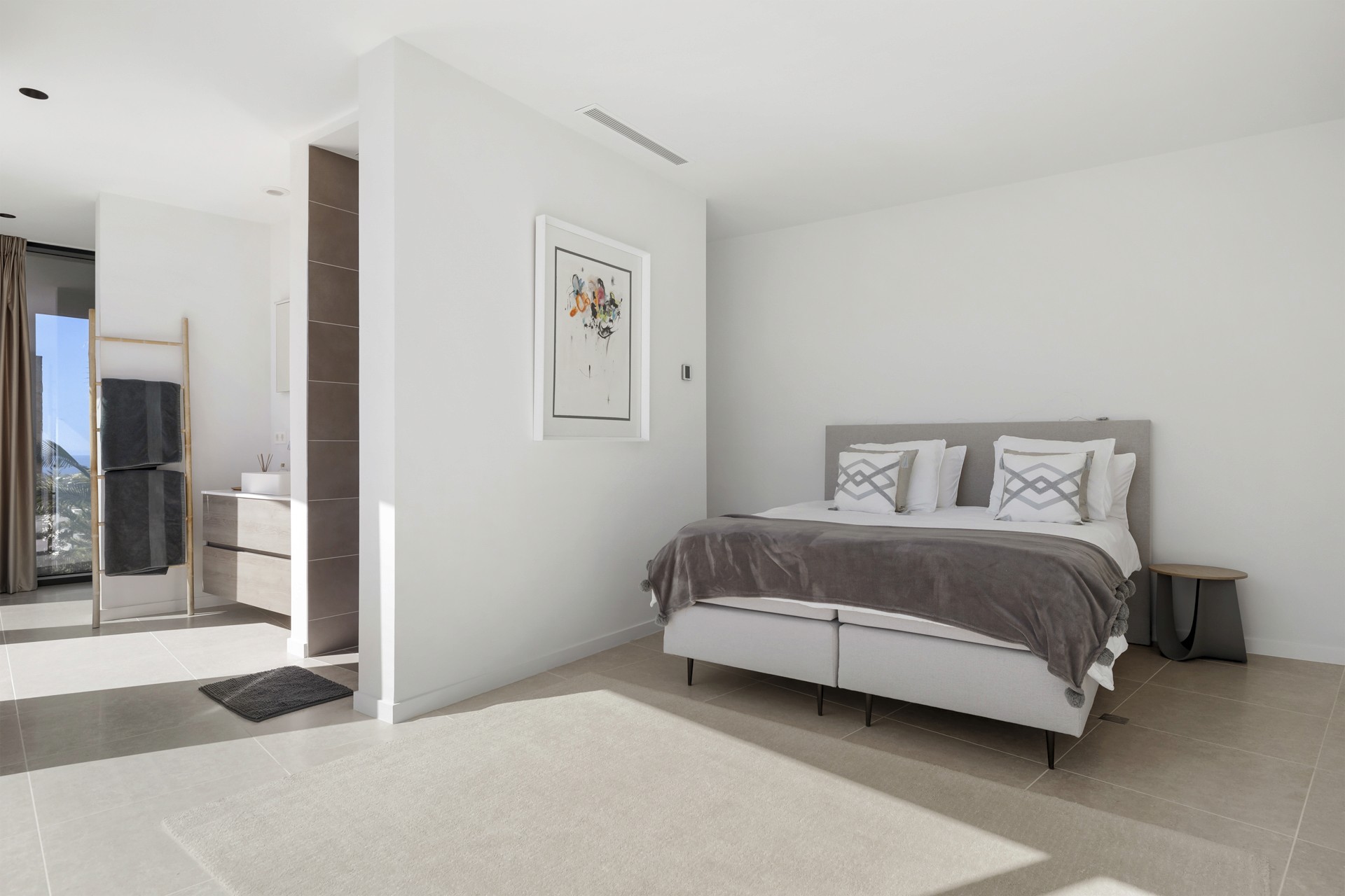 The outdoor areas include beautifully landscaped gardens and a 56 m² private swimming pool, creating an ideal environment for relaxation and entertaining. Upstairs, the master suite boasts a dressing area and a multi-purpose room suitable for use as an office or gym. All bedrooms benefit from direct terrace access with stunning sea and mountain views.