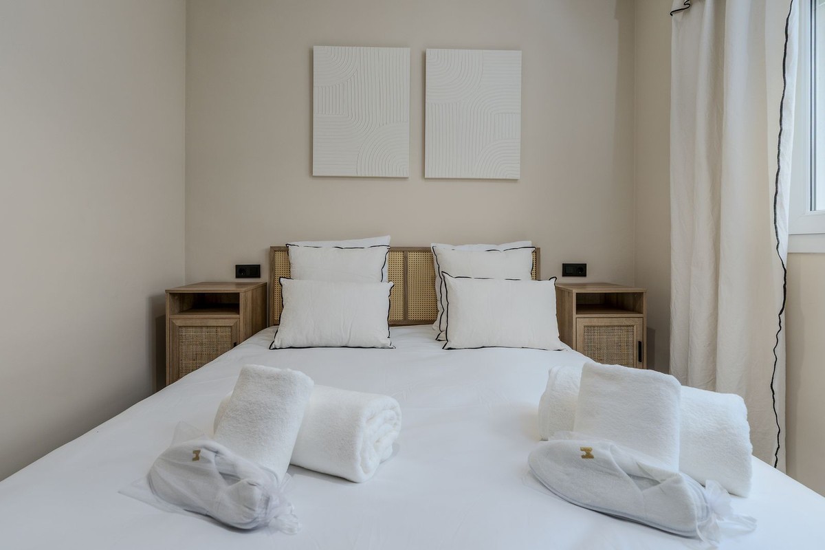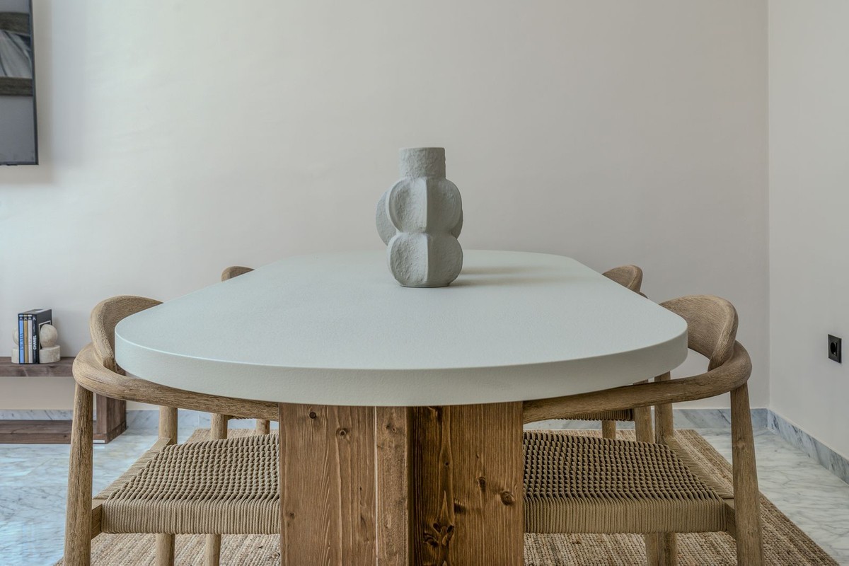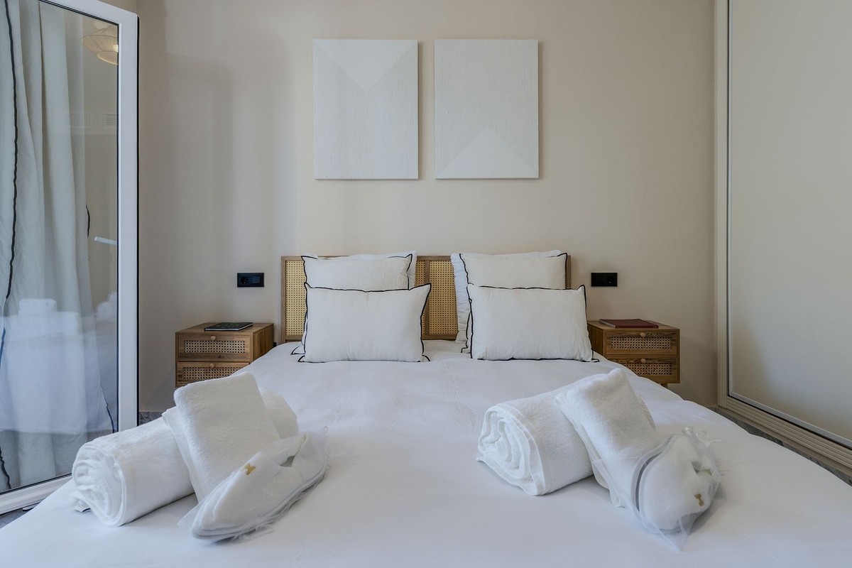 The living area opens onto a private terrace with direct sea views, providing the perfect setting for outdoor dining, morning coffee, or sunset evenings by the Mediterranean. The proximity to the promenade allows residents to enjoy beachfront walks, cycling routes, and immediate access to the coast.