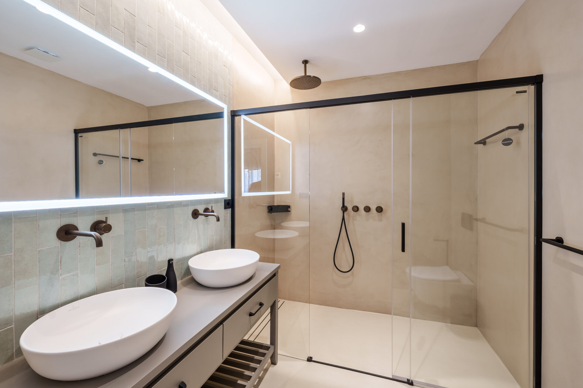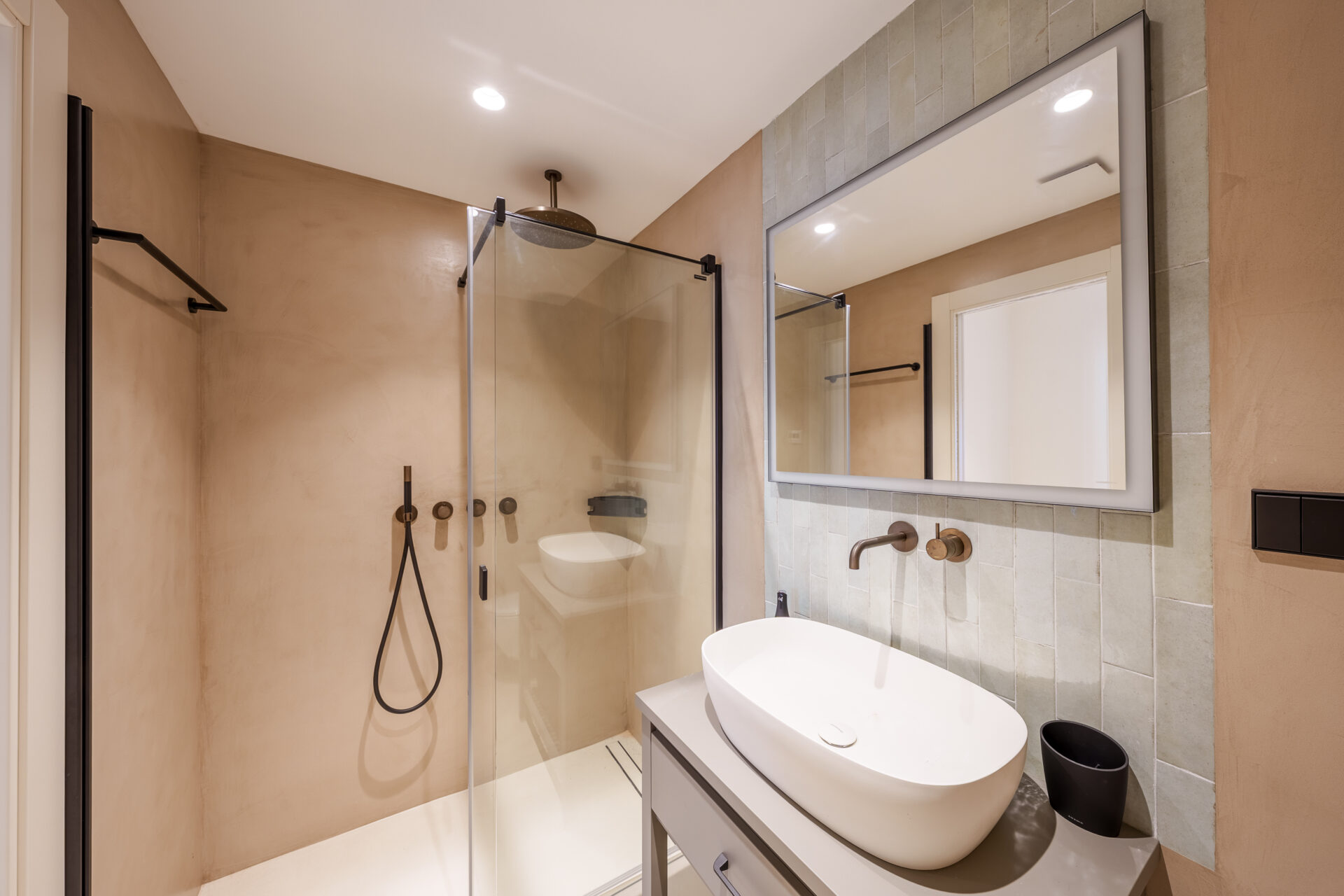 The apartment has been renovated to a high standard and features bright, modern interiors with a clean, contemporary finish throughout. The open living and dining area is spacious and welcoming, complemented by micro-cement floors and walls that create a sleek, minimalist aesthetic.