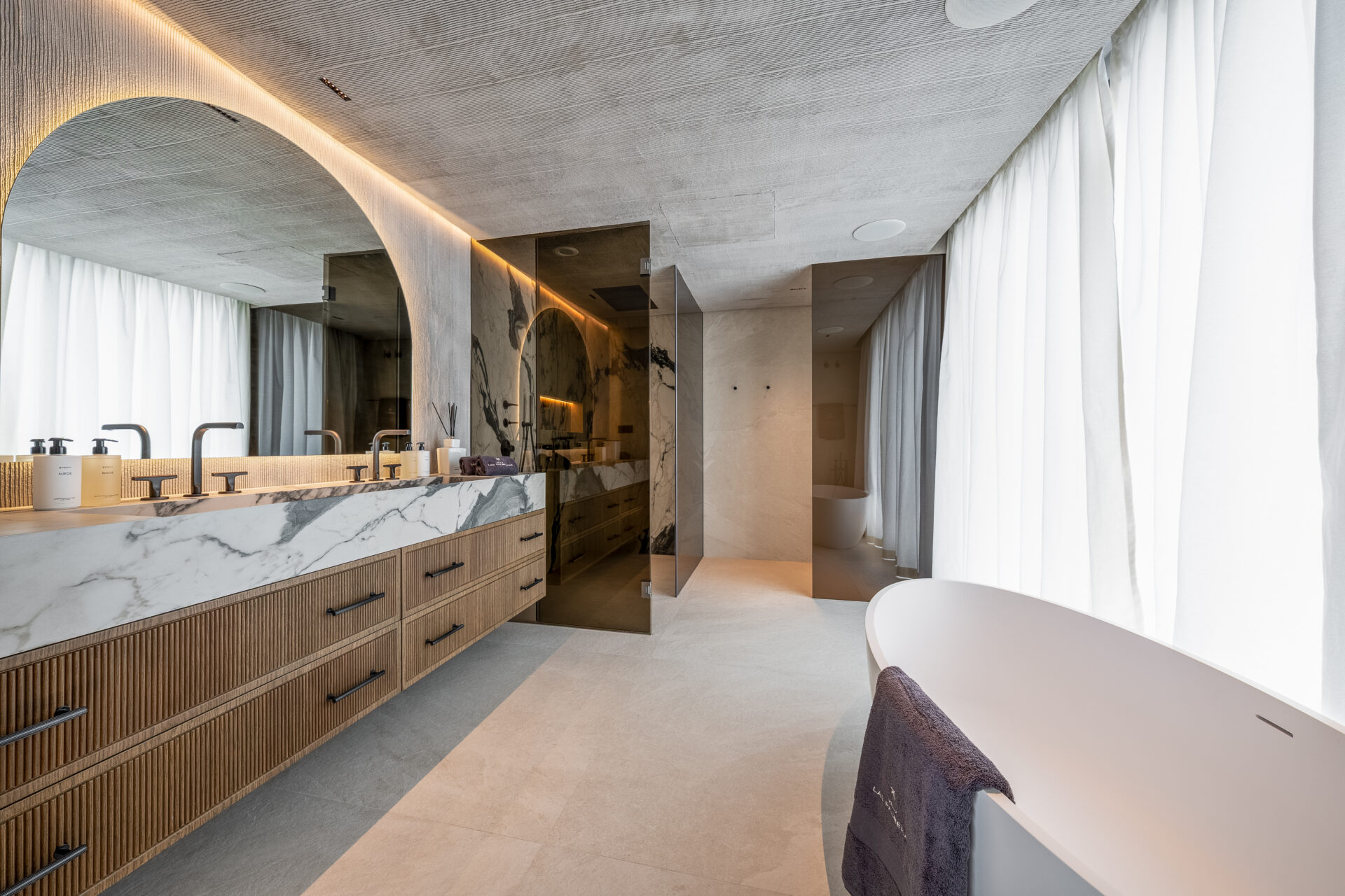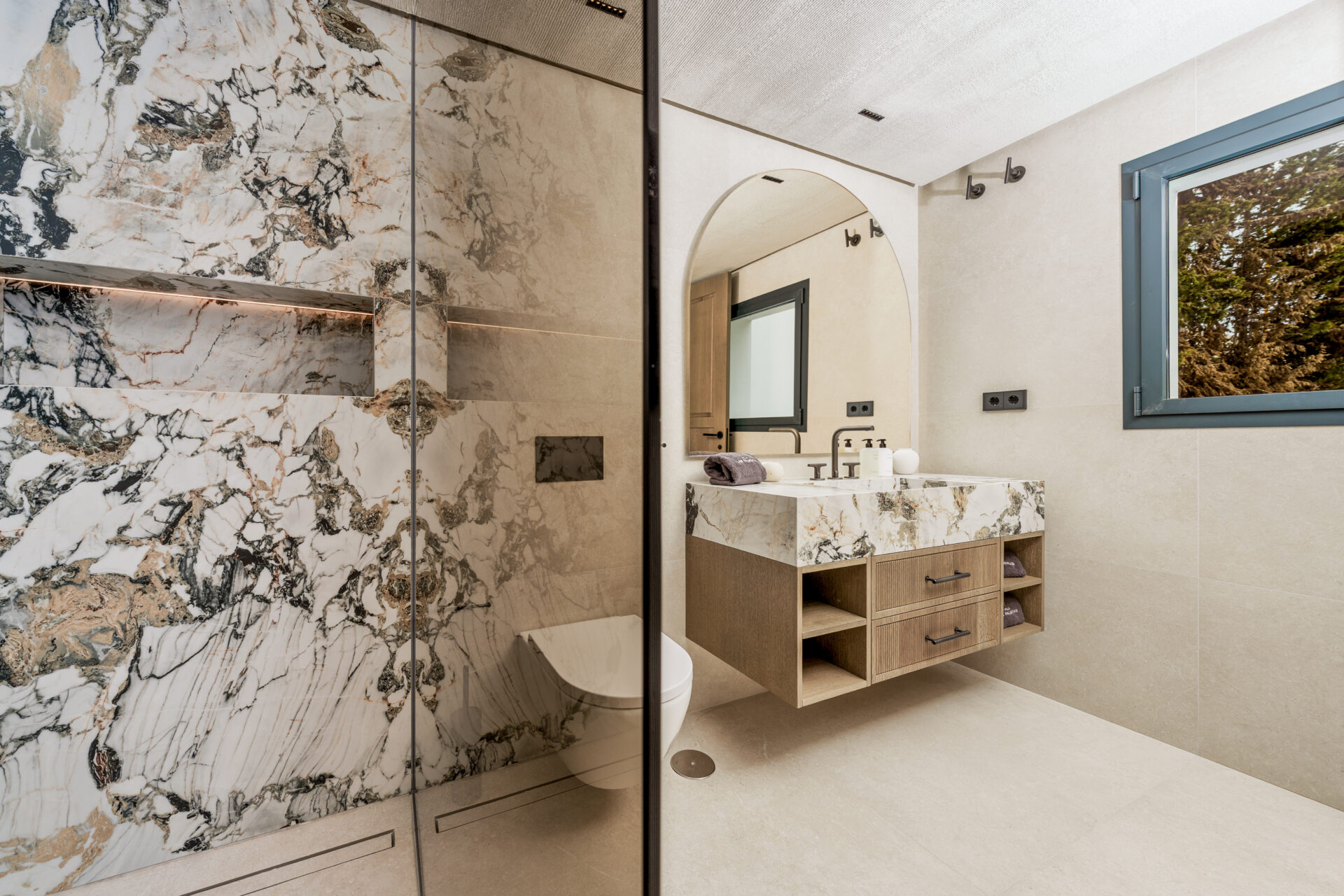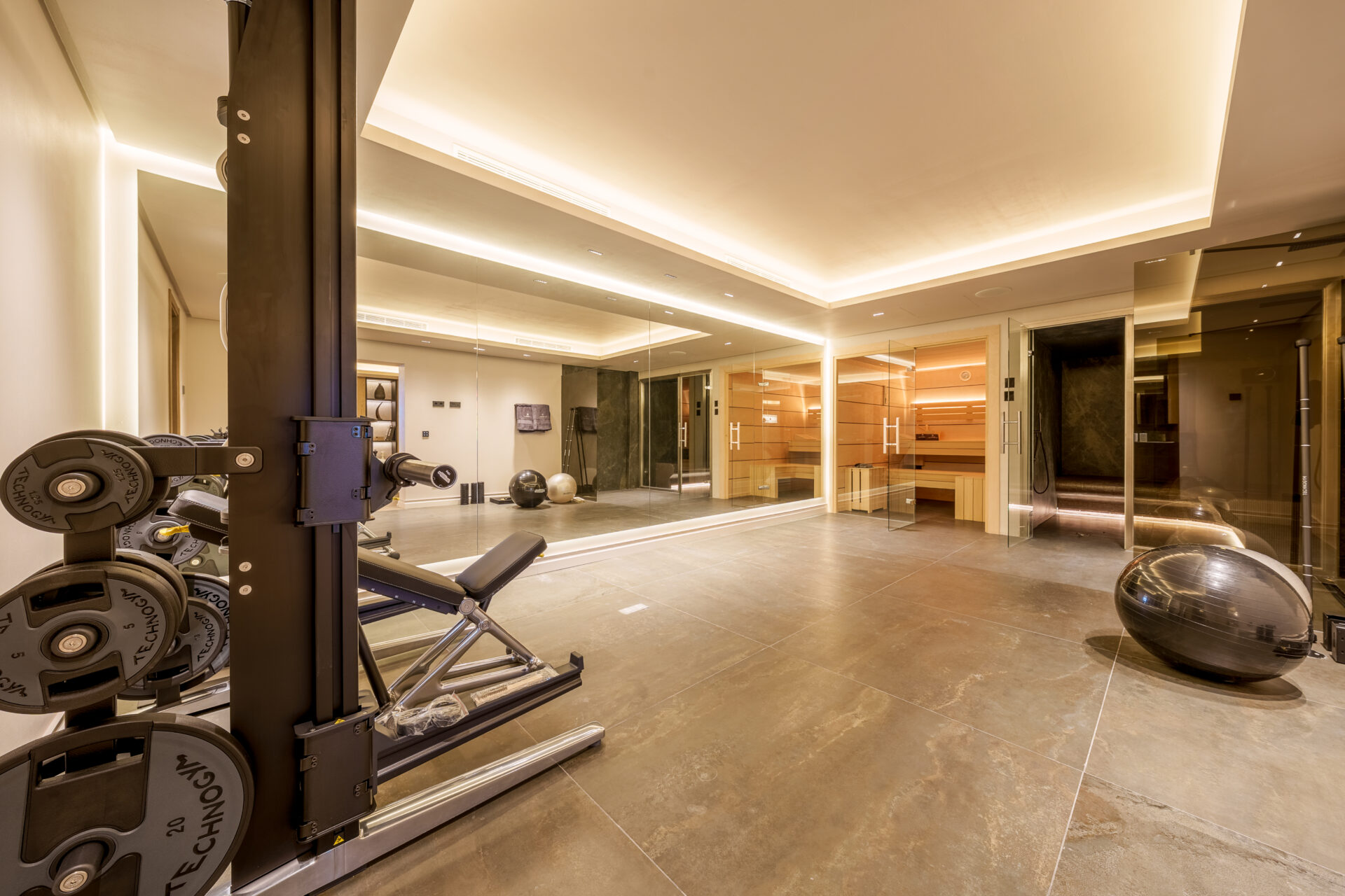 A standout feature is the 300 m² basement with 3-metre-high ceilings, designed as a dedicated leisure and wellness level. This space includes a private spa with sauna and steam room, a state-of-the-art home gym, a luxury home cinema, and a spacious garage with capacity for five vehicles, complete with direct access to the garden.