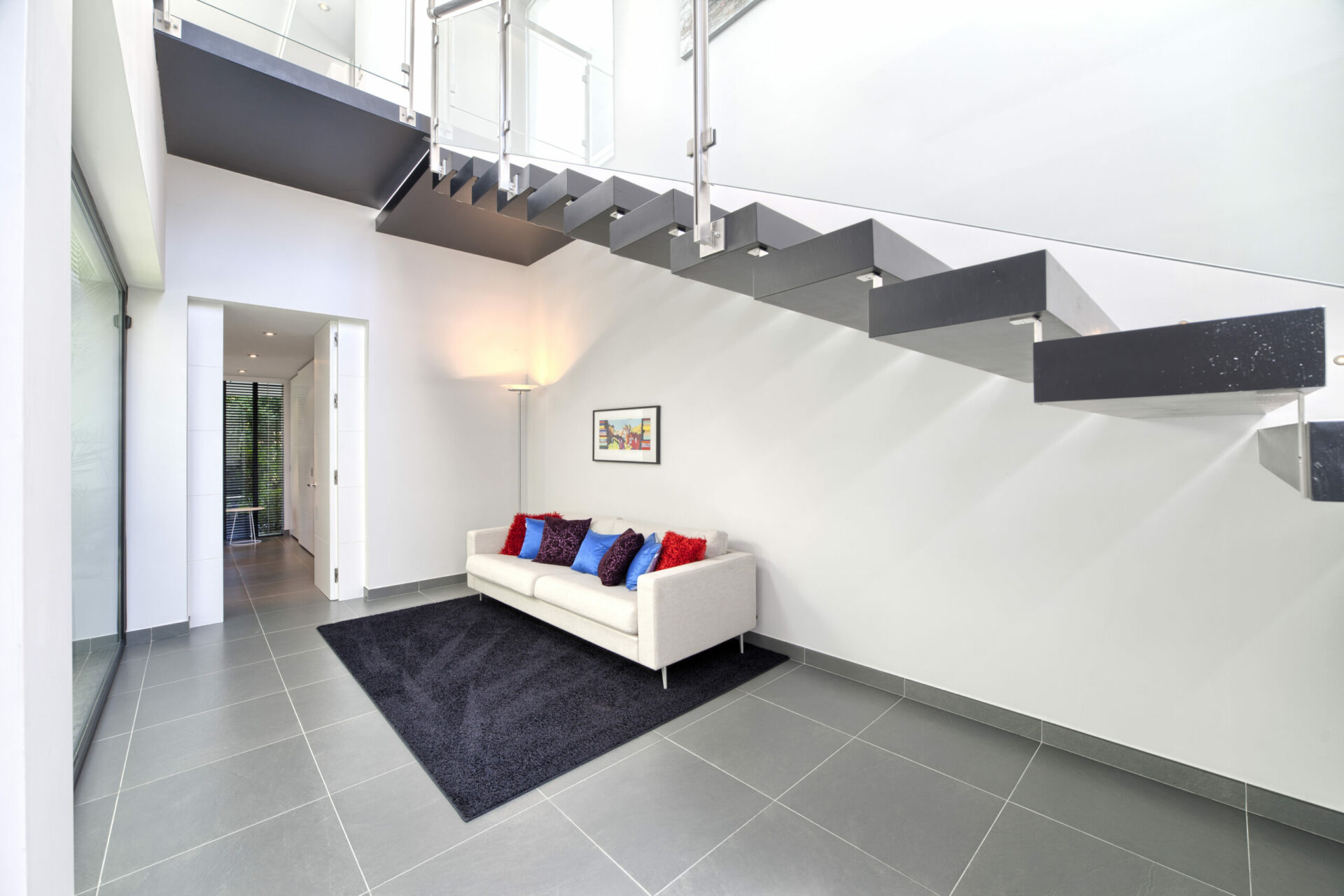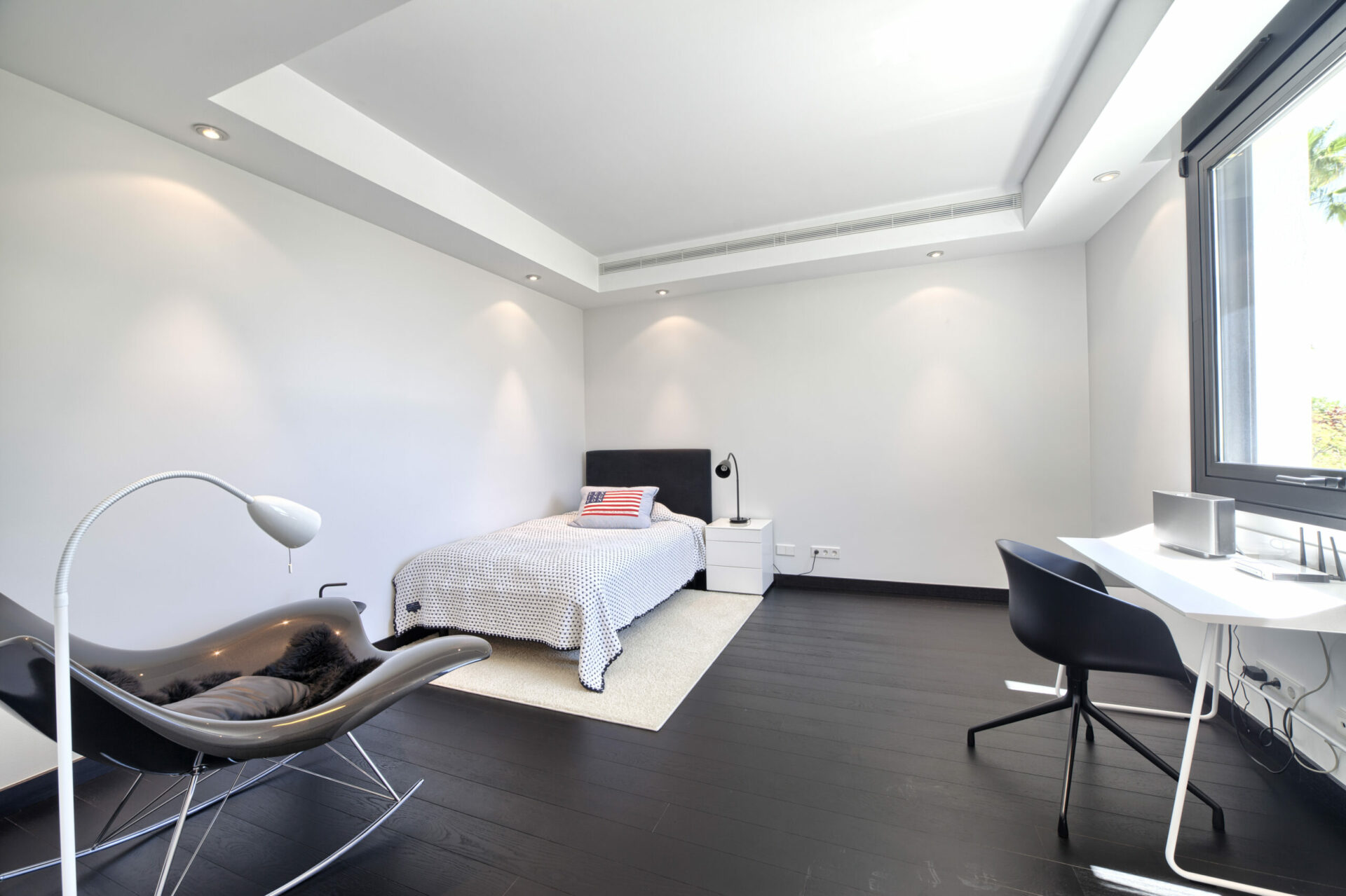 The upper floor is dedicated to the master suite, which enjoys a private terrace with sea views, alongside two additional en-suite guest bedrooms finished to high standards. On the lower garden level, a fully self-contained guest apartment with separate access includes a living area, bedroom suite, and private garage, making it ideal for visitors, staff, or rental use.
