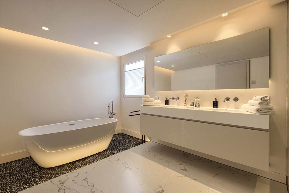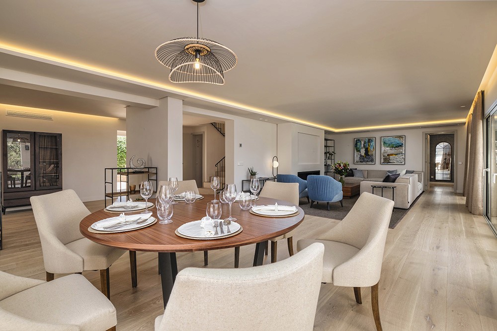 Built to high standards, the villa features four spacious en-suite bedrooms, generous living and dining areas with fireplace, fully fitted kitchen, and direct access to the private garden and swimming pool. The layout includes a main floor with open living spaces and guest accommodation, while the upper floor hosts the master suite and additional guest bedroom. A double garage plus an extra single garage provides ideal storage for vehicles or a golf buggy.